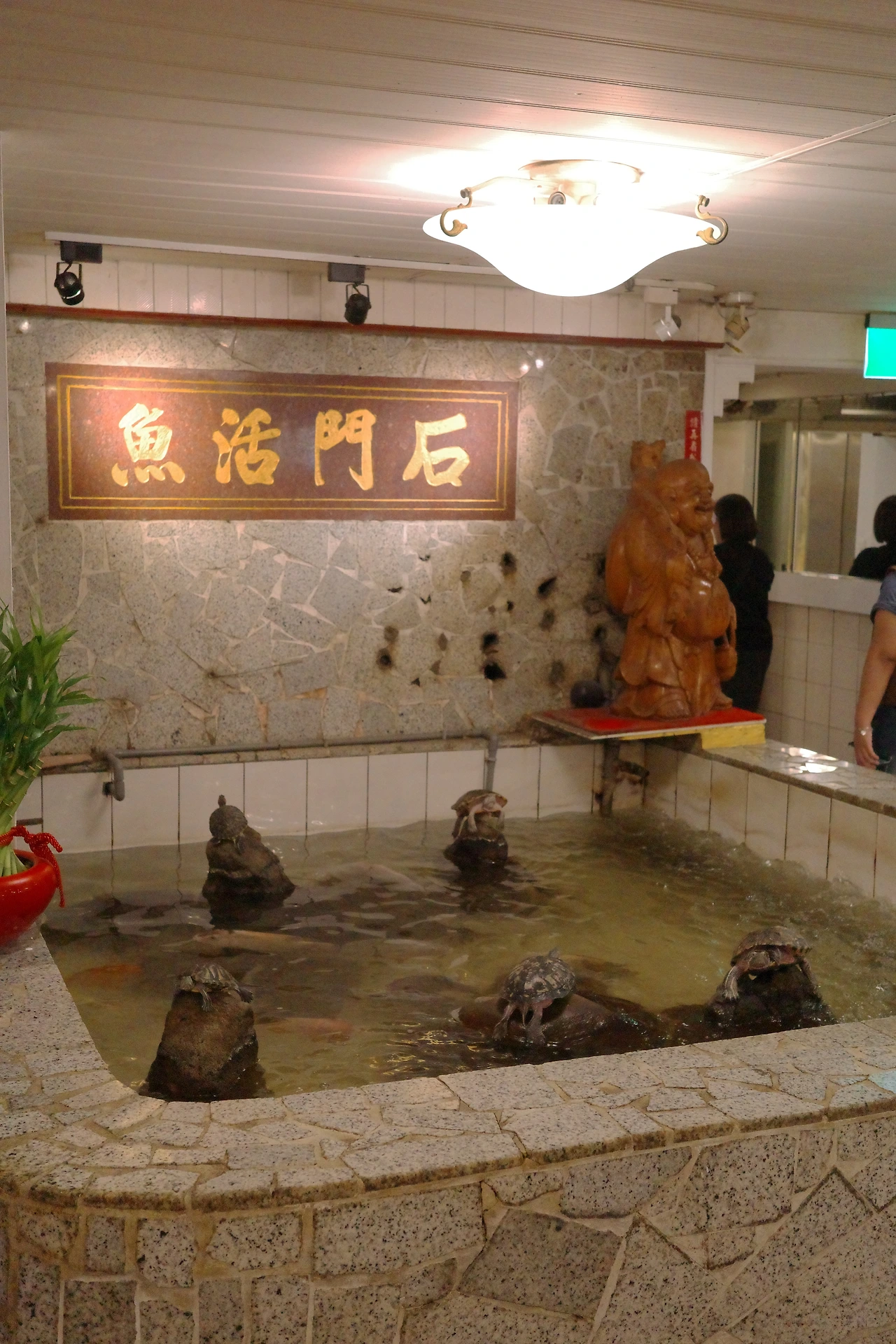 귀여운 사자 로고. 입구에서 살아 있는 거북이, 잉어들이 손님을 반갑게 맞아줍니다.