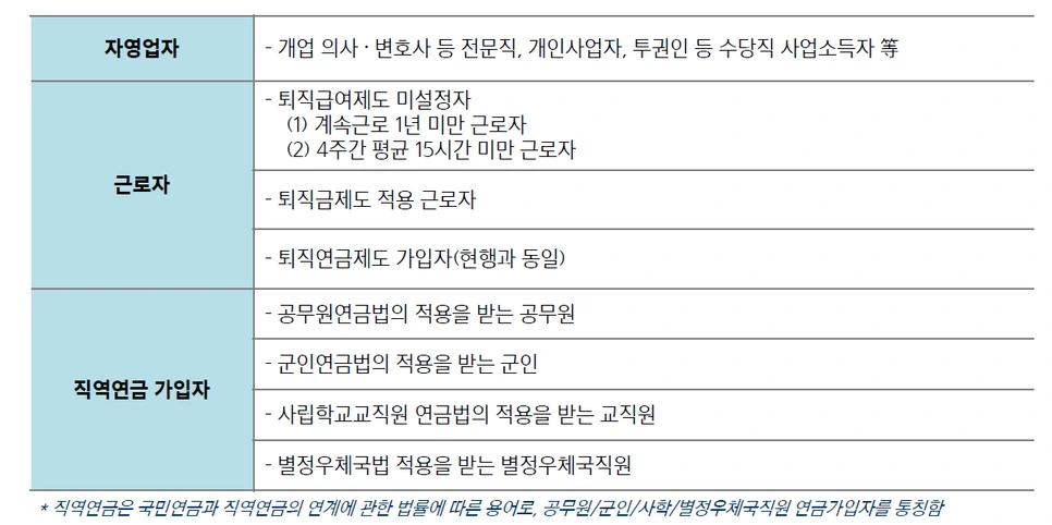 자영업자, 직역연금가입자, 퇴직연금에 가입하지 않은 고소득 임원 등