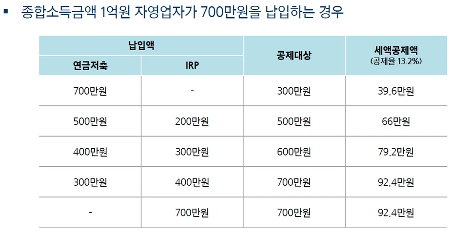 예를 들어, 종합소득금액 1억원인 자영업자가 기존에 연금저축만 가입하고 있을 경우,