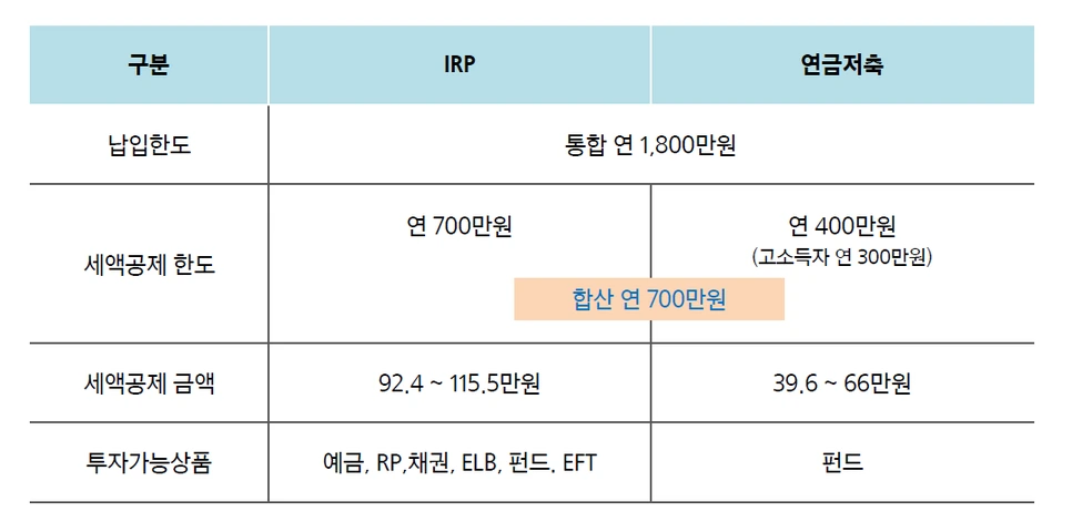 하지만, IRP를 가입할 경우 연간 700만원까지 세액공제의 한도가 확대되는 효과를 볼 수 있다.