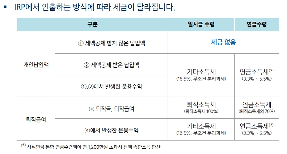 IRP 역시 연금저축과 마찬가지로 개인이 추가납입한 금액 중 세액공제를 받지 않은 금액은 과세되지 않는다.