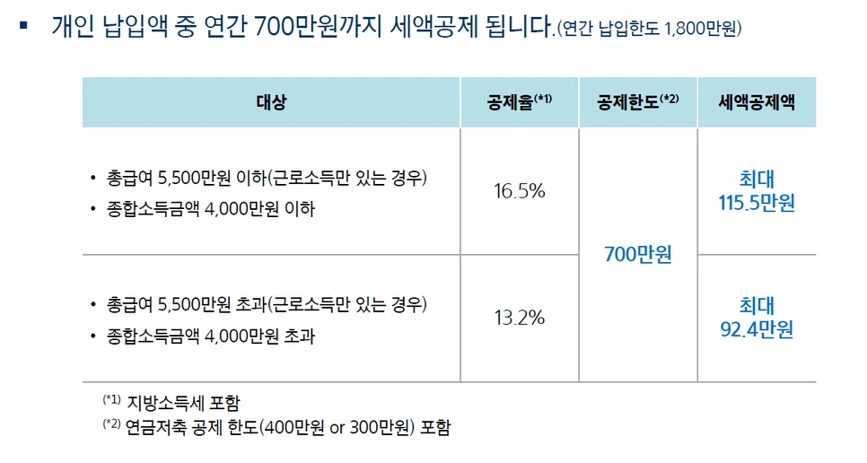 연간 700만원 한도로 세액공제가 가능하기 때문에,