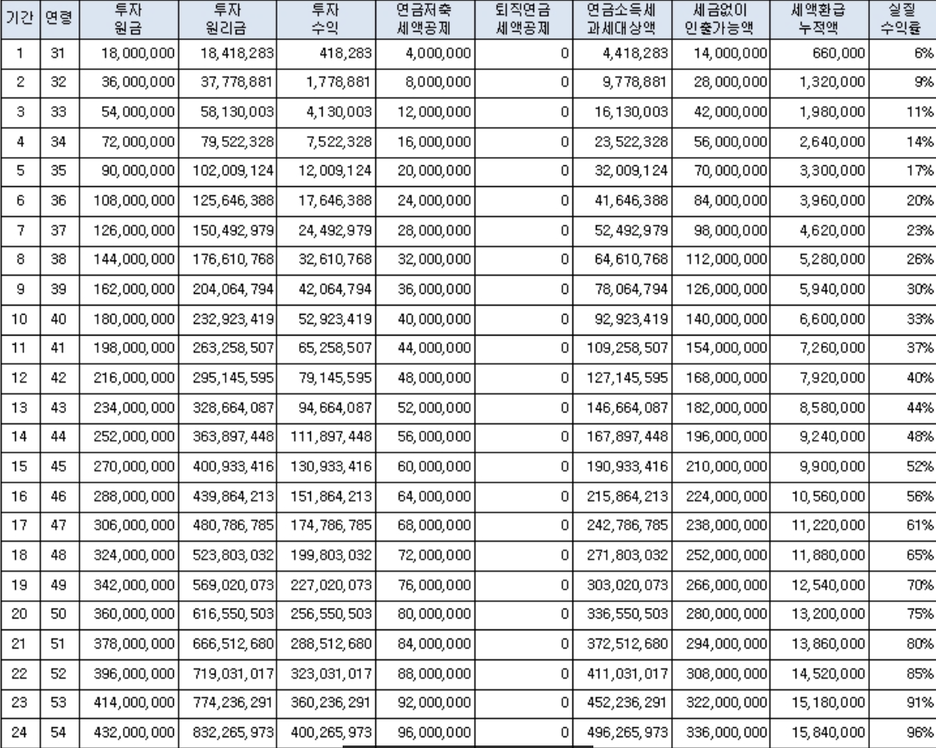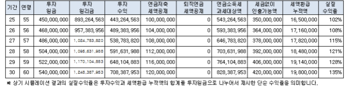 위의 예시에서도 알 수 있듯이 '세금 없이 인출 가능액'을 확인해 보면 30년 후에는 4억 2천만 원이라는 금액을 인출할 수 있는 금액이 생긴다.
