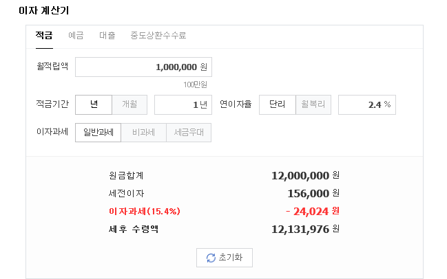 네이버 계산기를 활용해 계산해본 결과 100만원씩 1년을 납입하면 원금 1,200만원에 이자 131,976원 준다.