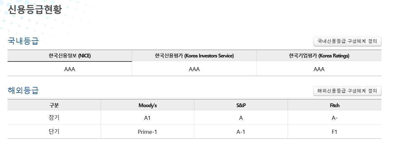 당연한 이야기지만 우리은행의 무디스 신용등급은 현재 A1, 우리나라의 신용등급은 Aa2로 우리나라의 신용등급이 높다는 것을 확인 할 수 있다. 이말은 즉, 우리은행의 적금보다 우리나라에서 발생한 채권이 더 안정적이라는 것을 알 수 있는 객관적인 자료라 할 수 있다.