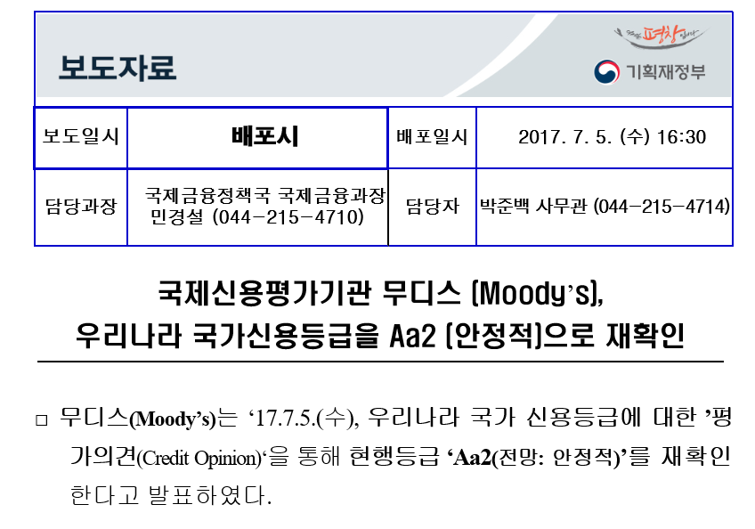 은행과 채권형펀드의 투자처인 우리나라의 신용등급을 비교해 보았다.