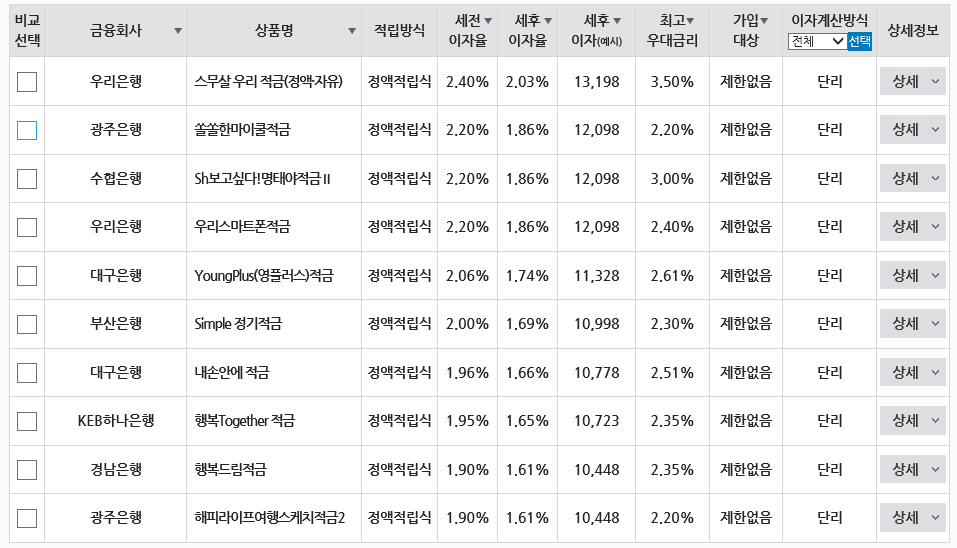 그나마도 중간에 일생겨서 납입 못하거나 해지하면 적금 역시 약정기간을 지켜야 하기 때문에 약정기간을 지키지 못하면 0.1~0.2%의 이자율이 적용된다. 또한, 만기 이후에 적금을 찾아가지 않으면 이후에는 금리도 절반이상 깍아낸다.