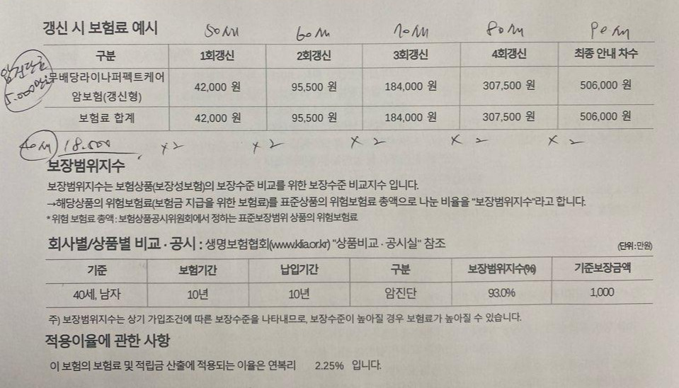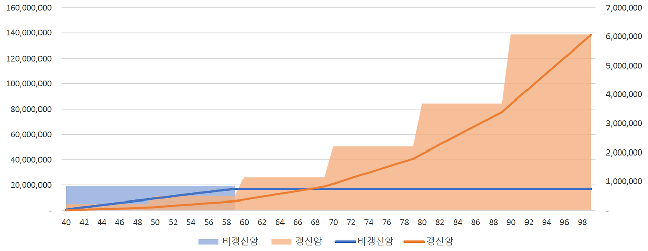 40세 남자 기준 암진단금 5천만 원을 가입하면 갱신형 보험의 보험료는 18,500원, 비갱신형 보험의 보험료는 71,150원으로 갱신형 보험에 비해 가입시점을 기준으로 3.85배 정도 보험료가 비싸다.