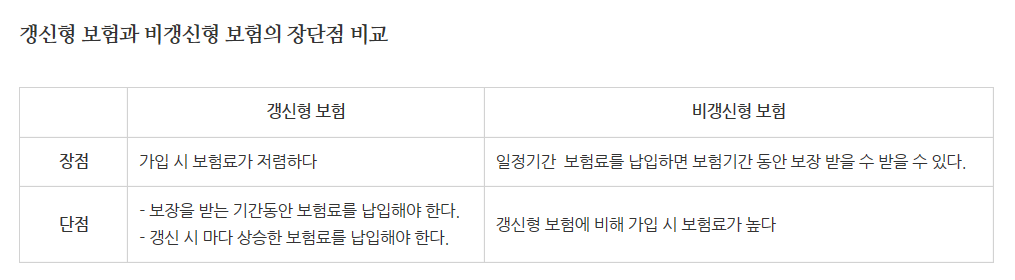 따라서, 보험을 가입할 당시에 보험료 납입 여력에 따라 갱신형 보험과 비갱신형 보험을 선택하는 기준이 될 것으로 판단된다.