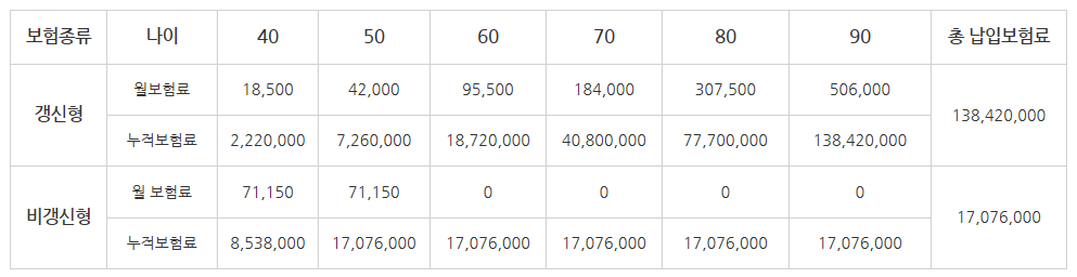 총 납입해야 하는 보험료는 갱신형 보험은 138,420,000원을 납입해야 하고, 비갱신형 보험은 17,076,000원의 보험료를 납입해야 한다.