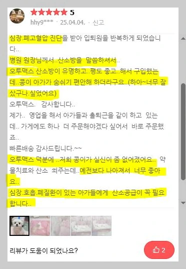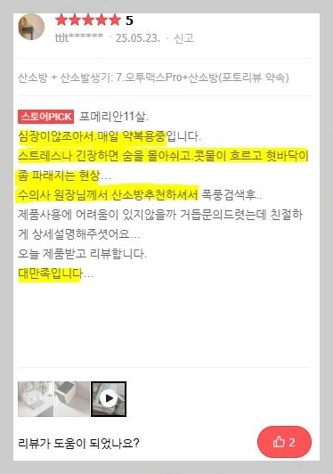 "기관지 협착증을 앓던 14살 말티즈 '사랑이' 견주님의 실제 후기입니다. '밤마다 거위 소리를 내며 기침하느라 온 가족이 잠을 설쳤는데, 오투맥스를 틀어주고 나선 정말 편안하게 잠들어요. 미리 사두지 않은 게 후회될 정도예요. 이젠 저희 가족의 필수품입니다.'"