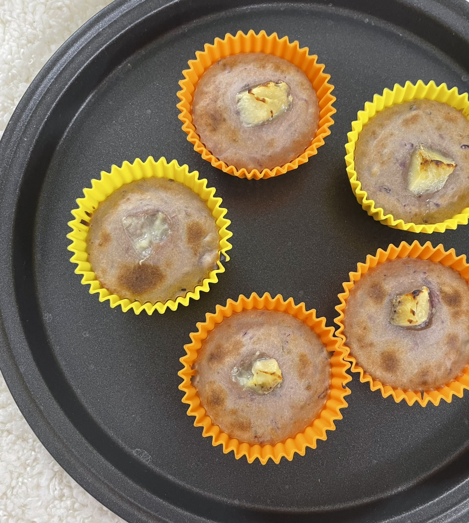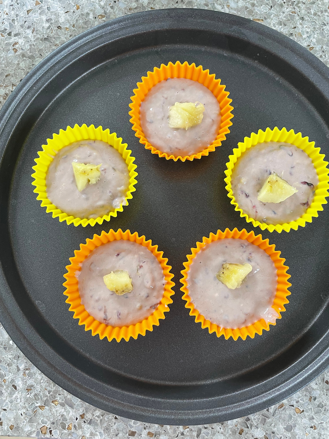 7. 머핀틀에 유산지 컵을 깔고 반죽을 80%만 채움. (실리콘 머핀틀을 사용했는데, 국산이 아니라 그런지 조금 불안한 엄마맘.. 여유되시는 분들은 머핀틀+유산지 조합으로 추천드립니다!)