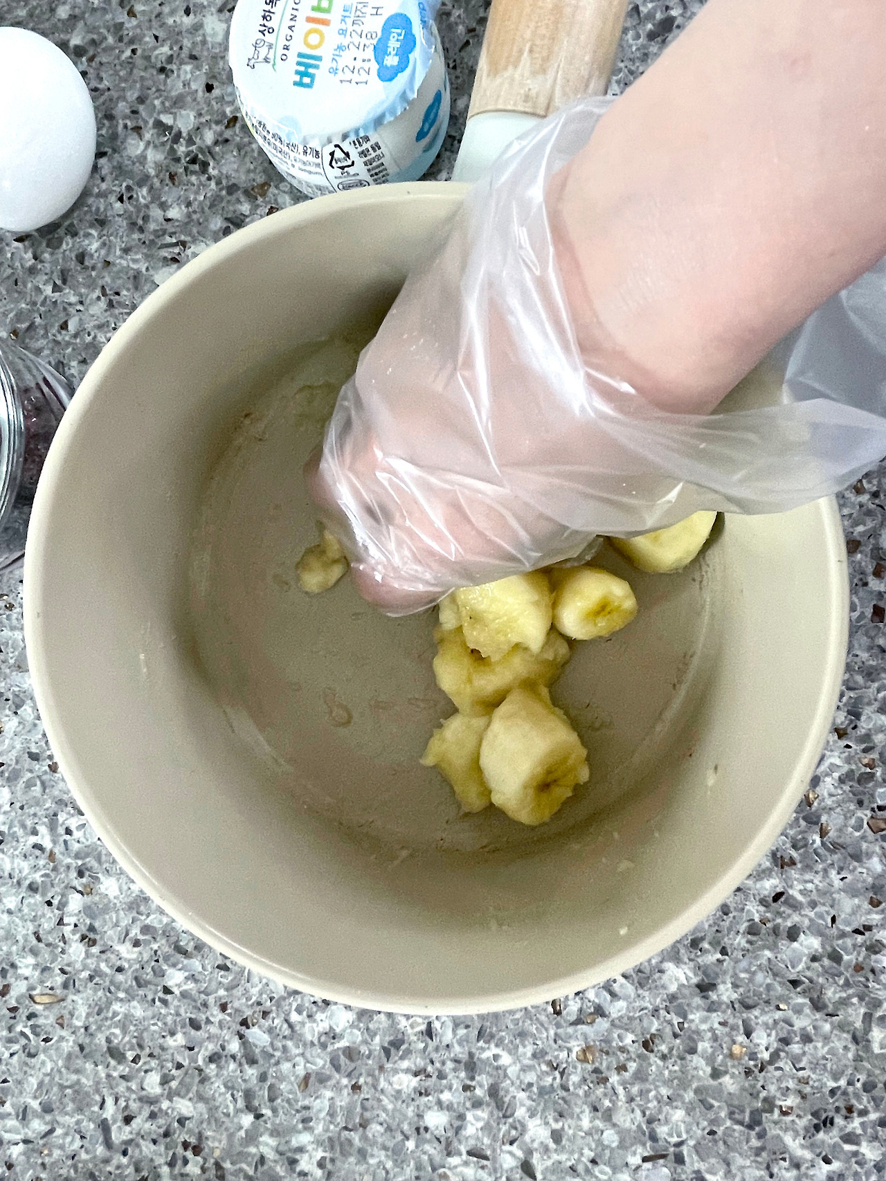 1. 바나나를 으깨서 퓨레의 농도로 만들어둔다.