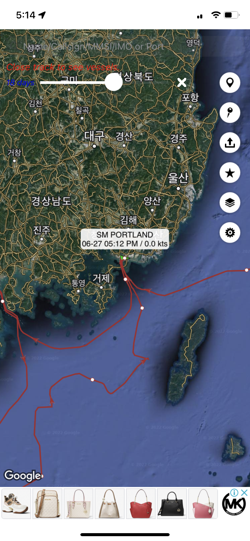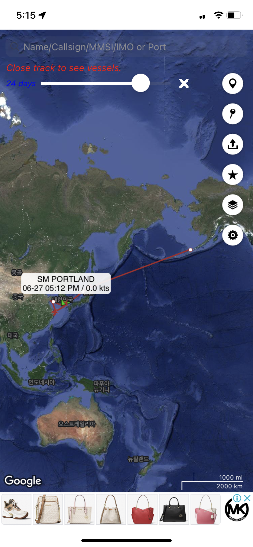설치된 어플을 열어 SM Portland 배를 검색합니다. 유료 서비스이지만 광고 하나 보면 배 한편을 확인할 수 있습니다. 운송 편명을 입력하고, 광고 하나(길면 30초 짧으면 5초)를 멍하니 보고 있으면 한번 검색할 수 있습니다. 좋은 것은 다음에 어플을 열었을 때는 그 배의 현재 위치로 창이 열립니다.