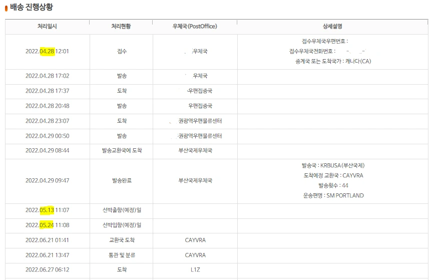우체국의 조회 화면에서도 선박 출항일과 선박 입항 예정일까지만 표시(아래 이미지의 노란색)되고, 그 이후에는 도착할 때까지 거의 업데이트가 되지 않습니다. 온 가족이 타지로 떠나는 마당에 우리에게 필요한 것은 심리적 안정감인데, 이렇게 불안하다니요!
