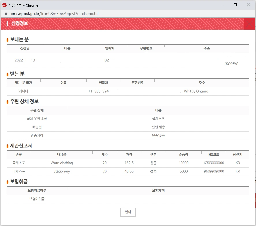 여러 개를 발송해야 하는 경우이면서, 발송인과 수취인이 동일한 상황에서 여러 장의 송장을 손으로 쓰기가 불편하기에, 보통 국제우편스마트접수(국제소포)를 온라인상에서 작성하게 됩니다.
