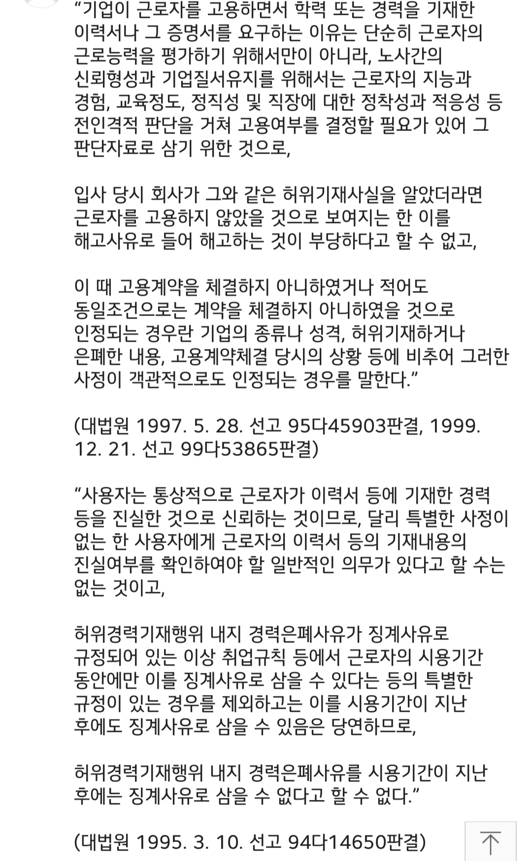즉, 적으라는 이야기입니다. 이력서에 거짓을 남기는 것은 피하는 것이 상책입니다. 안 했던 경력을 허위로 적은 것도 아니고, 부풀린 것도 아닌데 적지 않는 행위가 왜 거짓이냐고요? 노무와 관련된 판례에 따르면 '경력의 고의 누락' 또한 허위사실을 기재한 것에 해당된다는 결론이 난 적이 있고, 굳이 법적인 이야기를 갖고 오지 않더라도 이력서상에 내가 해당 기간을 고의로 빼버린 것은 나를 있는 그대로 드러내지 않은 것에 해당하기에 거짓말을 한 것이나 다름없습니다. 다시 말하지만, 이력서에서 숨기는 행위는 경력을 사실대로 쓰지 않은 것이기 때문에 문제 될 수 있습니다.