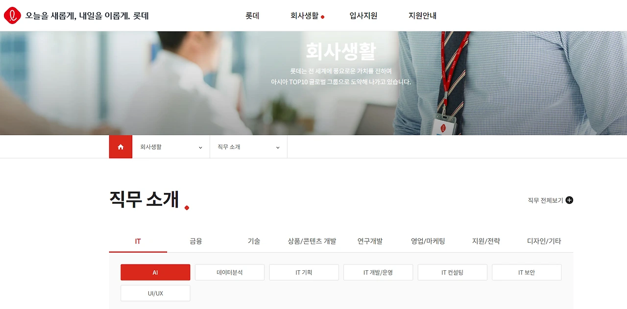 예를 들어서 포털사이트에 '롯데 채용', 'CJ 채용', 'SK 채용' 이런식으로 기업명 뒤에 '채용' 을 같이 넣어서 검색을 하면 쉽게 찾을 수가 있고 접속을 해서 직무설명이나 커리어 등의 메뉴들을 클릭해보면 어렵지 않게 내용을 접해볼 수 있습니다.