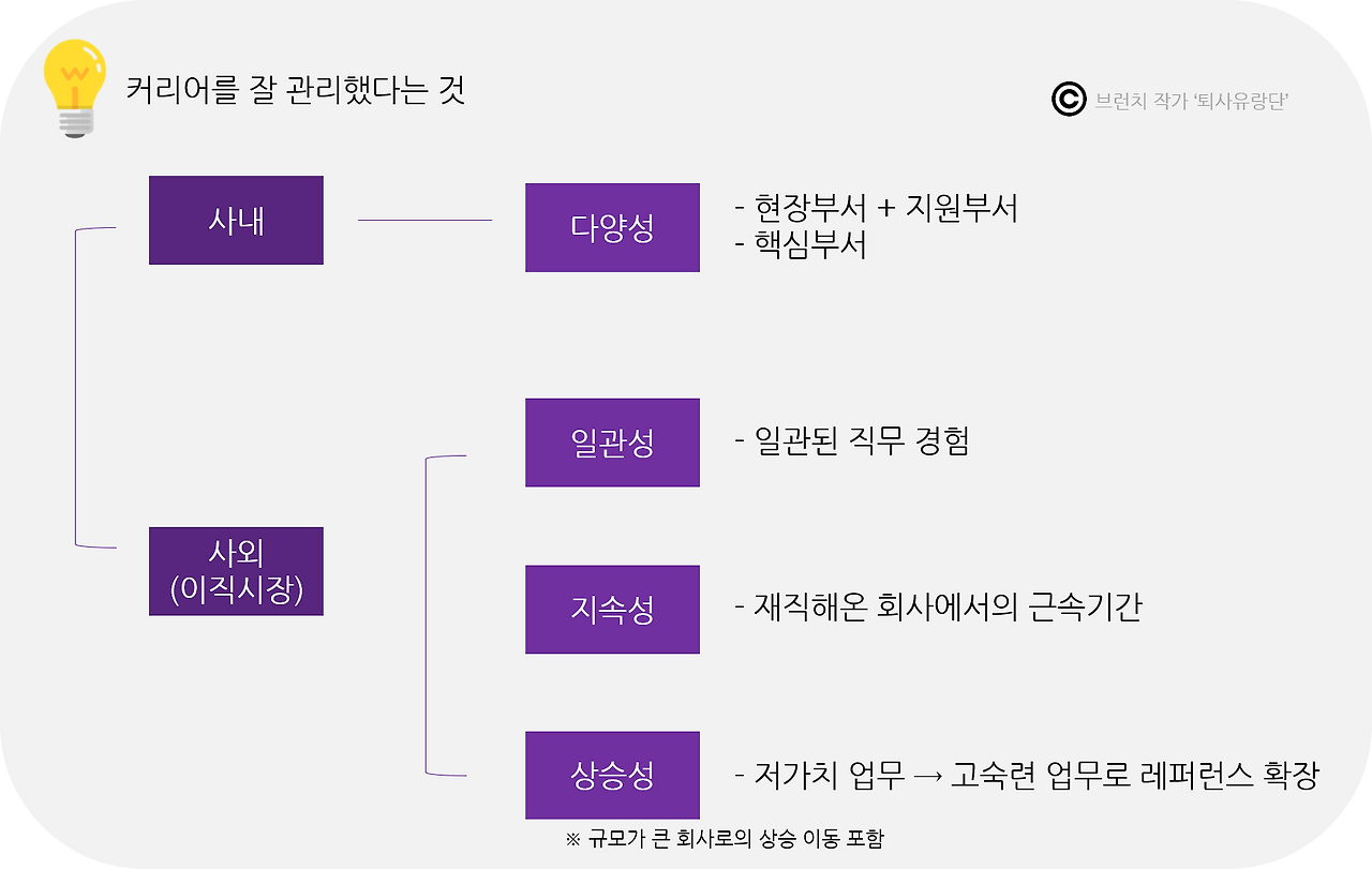 그 밖에도 아예 다른 직업으로 전환을 하는 '커리어 전직'을 한 케이스도 경력 관리 측면에서 성공했다고 볼 수 있겠고, 회사를 다니면서 전문자격증 취득(예: 문과8대전문직)으로 경력을 확장한 분들도 성공했다고 할 수 있습니다. 다만 상대작으로 흔한 케이스는 아니므로 이 범주에서는 빼도록 하겠고, 따라서 오늘 글을 도식화로 아래와 같이 정리해보며 마무리해보겠습니다.