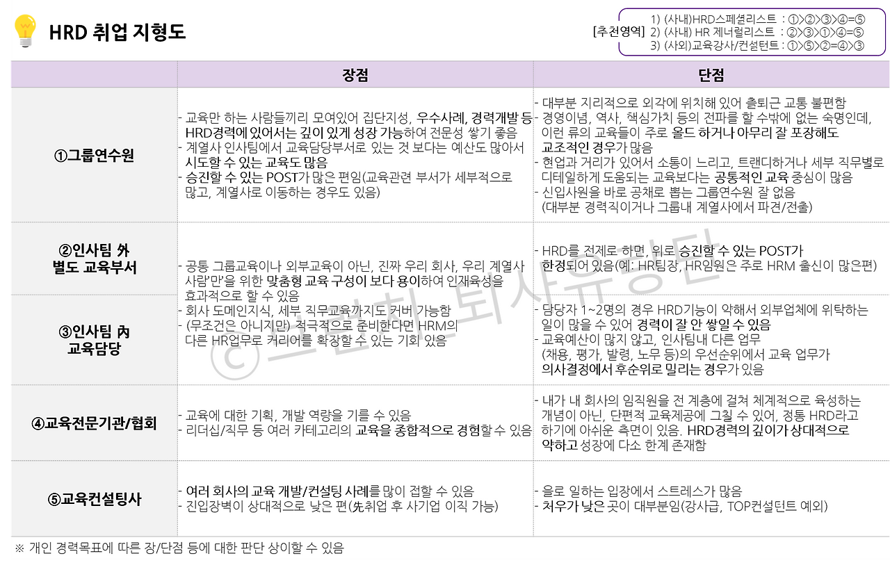 오늘은 제가 몸담고 있는 직무인 HRD 직무에 대한 취업 지형도에 대해서 소개를 해볼까 합니다. HRD 취업/이직 이라고 해서 딱히 특별할 것은 없으나 그래도 저는 HRD업무를 하면서 대기업 그룹연수원급, 대기업 인사팀, 교육부서, 외부 교육기관 등 다양하게 업무를 경험해봤기에, 취업할 수 있는 회사 영역별로의 특징은 다른 사람보다 자세히 알고 있는 편인지라 거기에 대한 이야기를 해보려고 합니다.