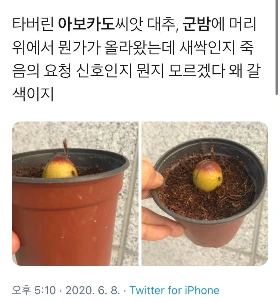하지만, 너무 뜨거운 햇빛에 놔둔탓에 그만 아보카도 씨앗의 머리 윗부분이 마치 앵무새 부리처럼 빨갛게 타고 말았다. 이러다 한 달 넘게 공들여 키운 아보카도 씨앗 죽는 거 아니야 걱정되서 트위터에 올렸더니, 군밤이랑 대추같다고 트친들이 군밤이와 대추라고 이름도 지어주었다.