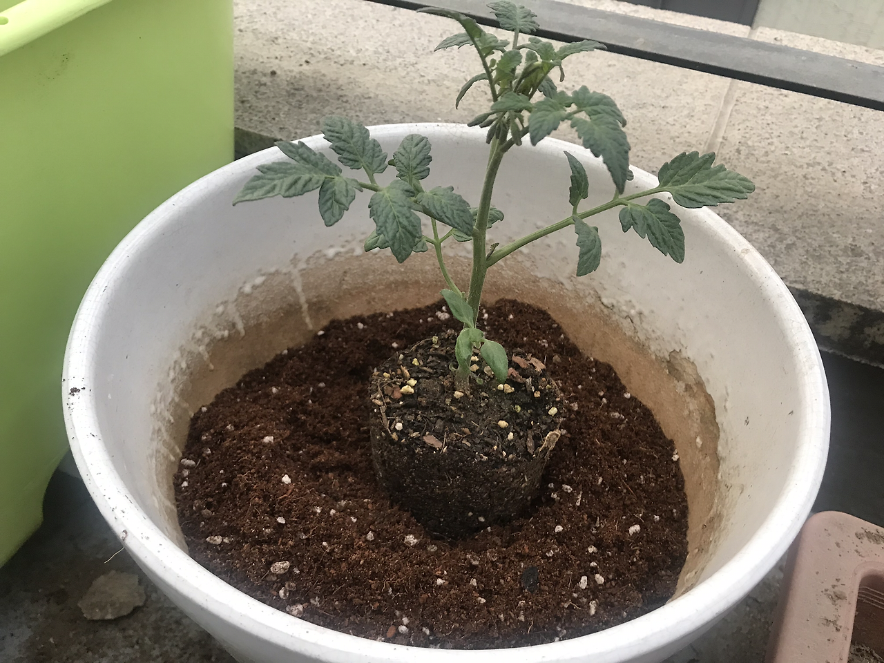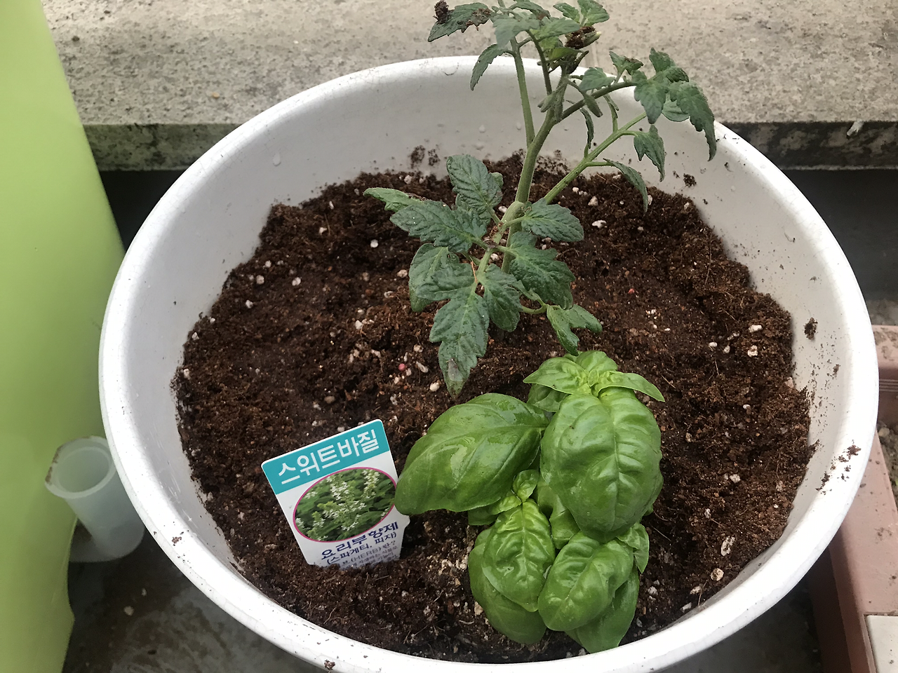 처음 모종을 심었을 때 사진. 1500원 주고 사온 방울토마토 모종을 바질과 함께 심었다. 토마토와 바질을 같이 심으면 맛이 좋아진다는 이야기를 어디선가 들었기 때문이다.