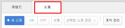 이렇게 소재까지 생성해주시면 키워드와 소재 검수가 완료되면 브랜드 검색을 진행할 준비는 완료입니다. 이후 브랜드검색에 대한 계약을 진행하면 되는데요. 도구에 계약 관리를 들어갑니다
