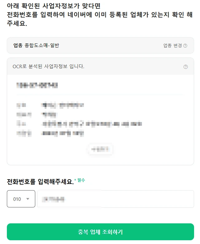 사업자등록증 확인이 완료되면 구체적인 정보와 함께 전화번호를 기입하는란이 나오게 됩니다. 올바른 전화번호를 적어주신 후 넘어가 주시면 됩니다.