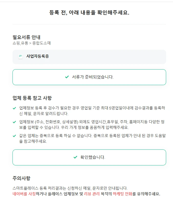 비지니스 카테고리를 정해주셨으면 사업자등록증 준비여부 및 업체 등록 참고 사항, 주의사항 관련 "확인했습니다"로 체크 해주시고 넘어가 주세요.