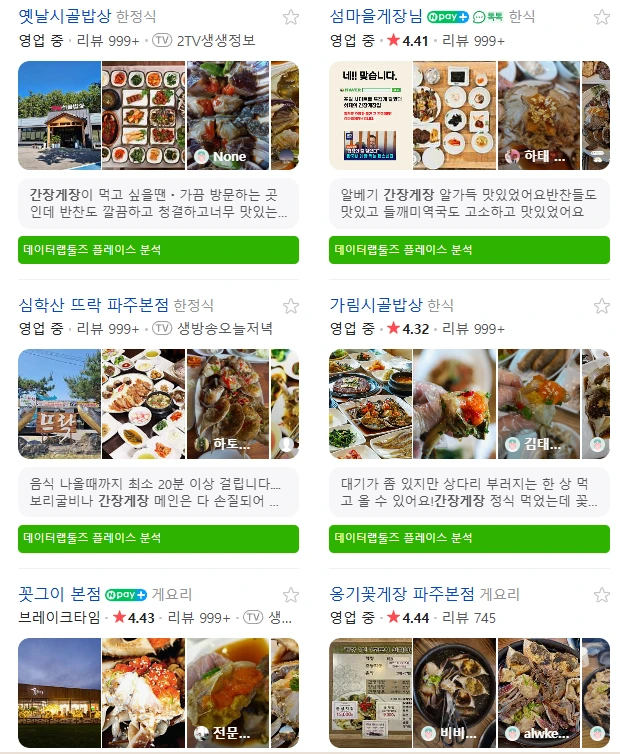 위처럼 다양한 가게에서 카테고리를 정해서 세팅해놓으신 것을 확인 하실 수 있고 저는 광고 지면 외 일반 지면 상위 노출되어 있는 "한정식" / "한식" / "게요리" 중 선택하여 적용할 것 같습니다.