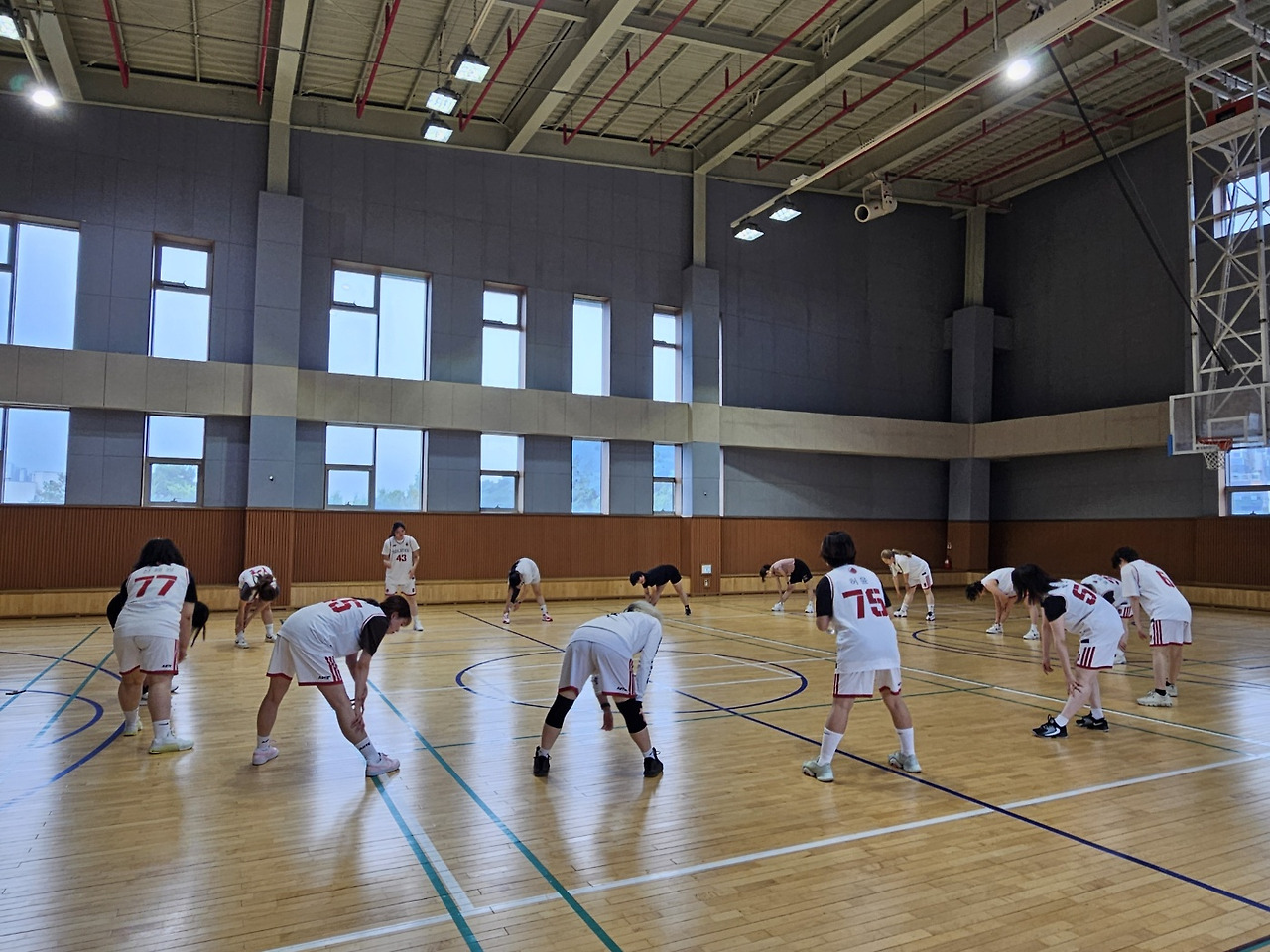 처음에는 출석 부르고 스트레칭을 한 다음에 몸풀기로 다섯 바퀴 정도 돌아요. 그다음에 레이업이나 패스 연습을 하면서 기본기를 다집니다. 마지막에는 30분 정도 작은 게임을 하는데 몇 명이 오느냐에 따라 3대 3이나 5대 5를 해요.