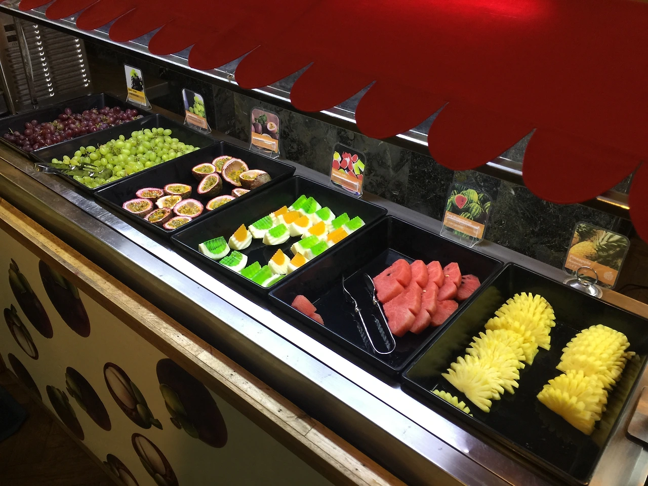 들뜬 마음으로 저녁시간이 오기만을 기다렸다. 남편은 완벽한 이벤트를 위해 나를 로비에 두고 혼자서 뷔페 입장 티켓을 사러 갔다. 4시 반 타임 입장에 먹을 수 있는 시간은 2시간 제한. 시간이 되어 남편의 손을 잡고 입장한 곳은... 고기뷔페도, 해산물 뷔페도 아닌 과일 뷔페였다.