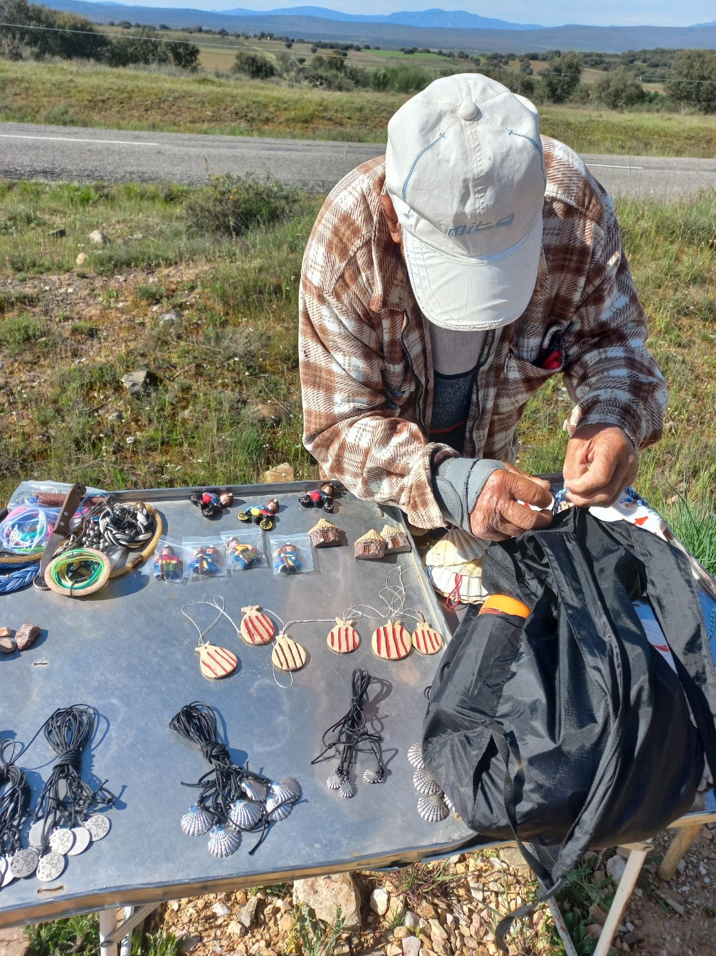 내가 멈추어서 아저씨의 좌판에 관심을 갖자, 표정이 밝아졌다. 아저씨가 팔고 있는 것은 산티아고의 상징이자, 성야고보를 상징하는 가리비로, 아저씨의 행색으로 볼 때 급조된 상인이다. 검게 그을린 얼굴과 거칠고 뭉뚝한 손이 아저씨는 머리로 사는 사람이 아니라 몸으로 사는 사람이라는 것을 말해주고 있다. 영락없는 우리 동네 아저씨들의 모습이다.