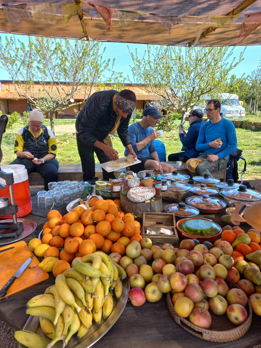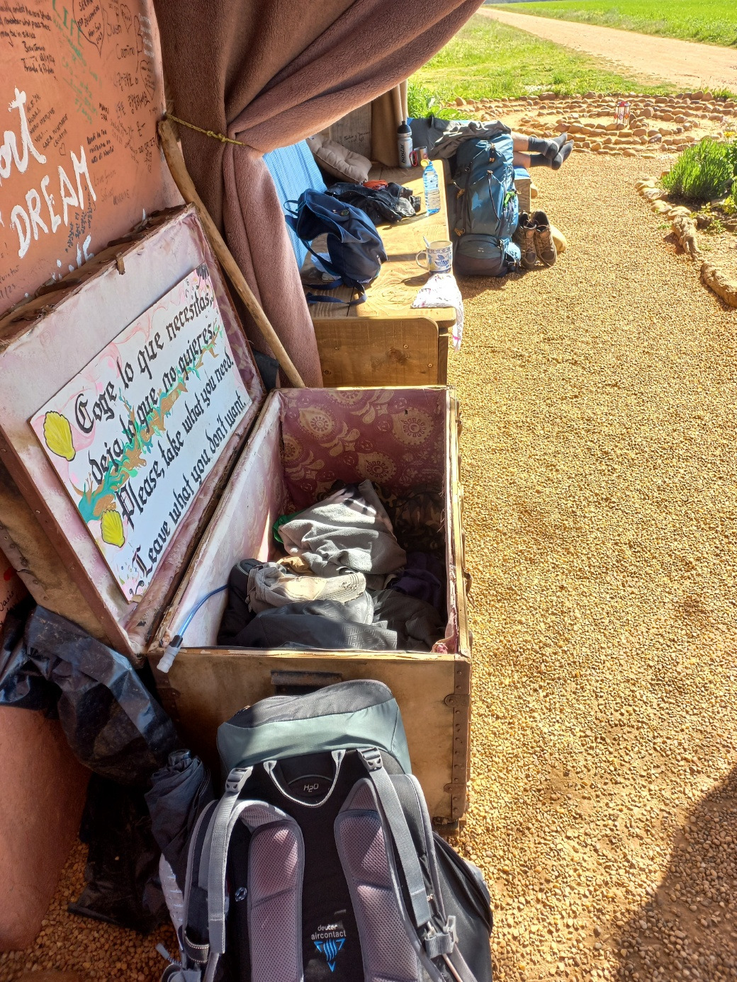 오르비고에서 아스토르가의 중간쯤 되었을까, 산길이 이어지던 어느 지점에서 노포처럼 꾸며놓고 빵, 커피, 티, 과자, 과일 같은 먹거리를 쌓아 놓은 곳에서 사람들이 둘러앉아 음식을 먹고 있는 모습을 보게 되었다. 커피라도 한잔 마실까 싶어 주변을 둘러보았으나 손님을 맞는 주인도 계산대도 보이지 않았다. 배가 고팠던 터라 우선 먹고 보자 싶어 커피와 오렌지 한 개, 삶은 계란 한 개, 쿠키 한 개를 집어 들고 빈 의자에 앉아 먹었다. 나중에 주인이 계산하자고 들 때 계산이 편하도록 한 개씩만 골랐다. 마음 한편으로는 이런 산중에서 장사를 하자면 도시보다 물건값을 비싸게 받겠지 싶기도 했고, 바가지를 쓰게 되더라도 많이 쓰지는 않겠다는 얕은 계산속도 있었다.