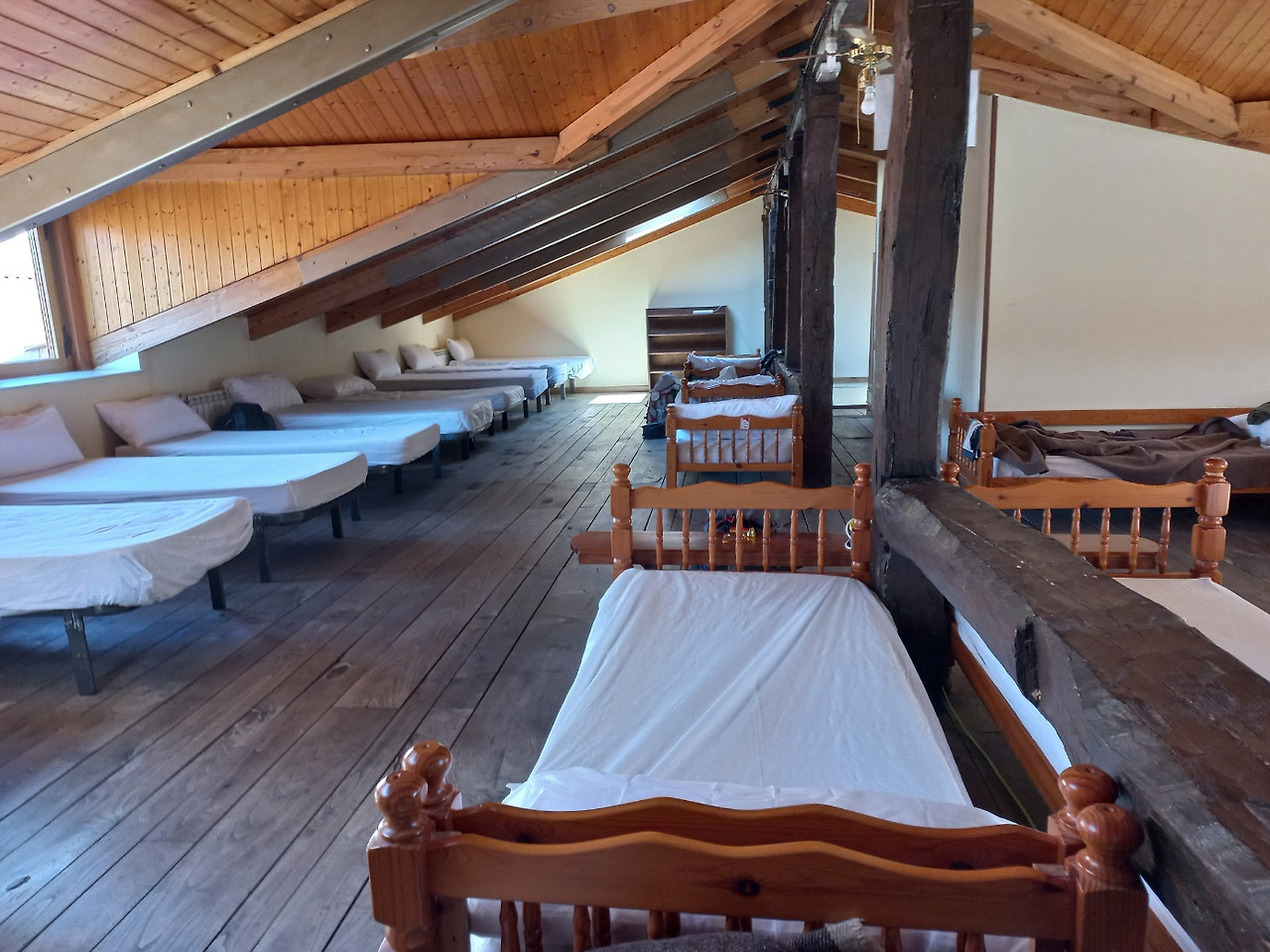 나무바닥 위로 일인용 침대가 빼곡히 놓여 있다. 족히 30개는 넘어 보였다. 일찍 와 자리를 차지하고서 잠이 든 사람, 누워 책을 읽거나 휴대폰을 보는 사람이 군데군데 있다. 순례길에서는 남녀공용실은 처음이다. 코 고는 사람은 없을까? 문득 스치는 불안. 웬 걱정. 코골이가 나일지도 모르잖아. 낮게 키득대며 입구에서 가장 멀리 있는 세로로 놓여 있는 침대 위에 작은 가방을 올려놓았다. 대각선에 있는 천창으로 별을 볼 수도 있을 것 같다.