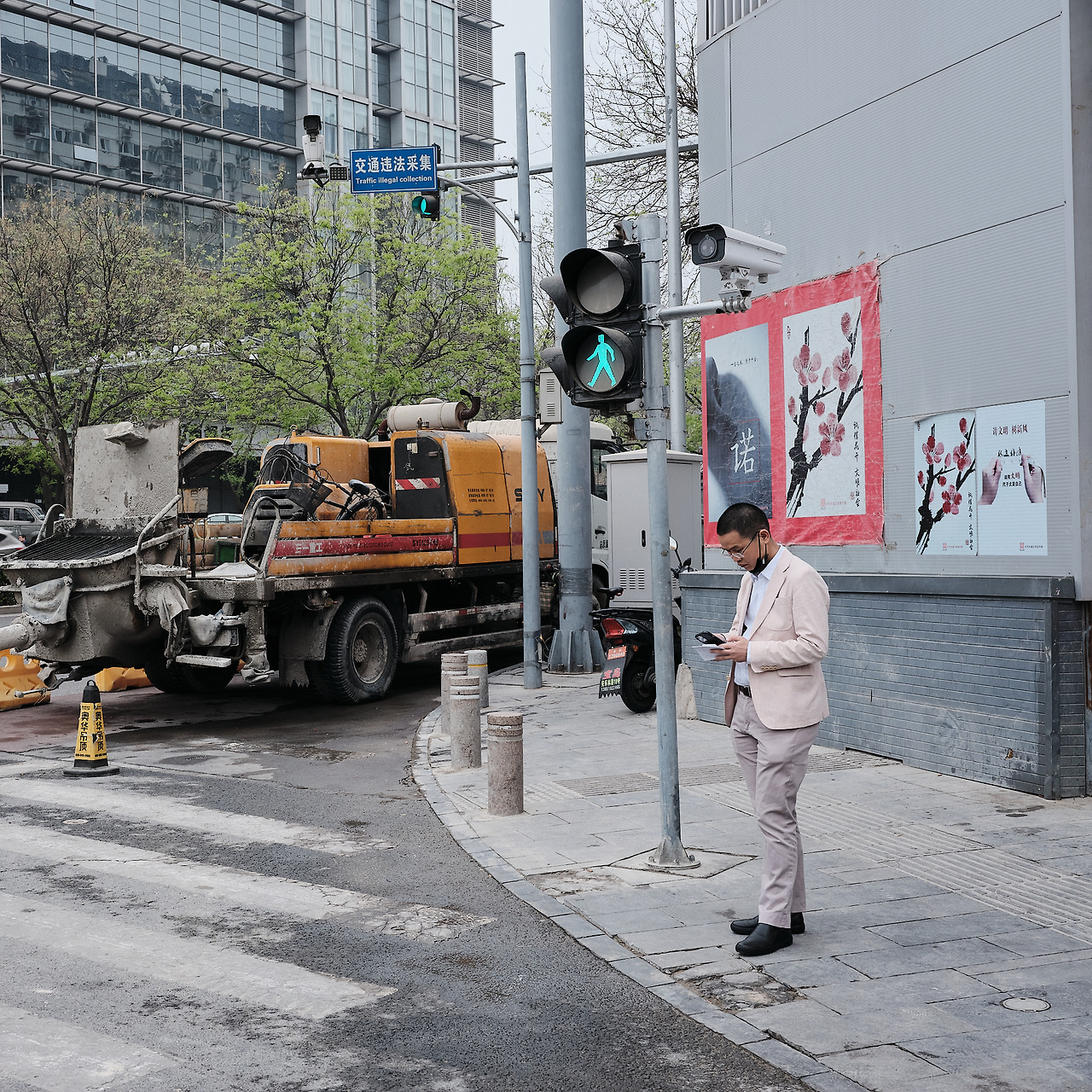 산뜻한 느낌의 옷과 뒤로 보이는 꽃 포스터와 봄의 느낌을 깨려는 듯한 공사 트럭. 세 요소를 한 프레임에 담으면 재밌을 것 같다는 생각이 들었다. 그래서 신호가 떨어지기 전에 재빨리 한 컷을 담았다.