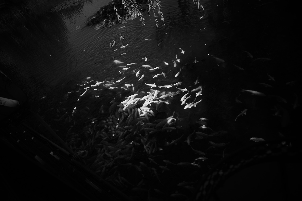 햇빛을 받은 잉어들이 먹이를 던져 주는 소리에 입 벌리느라 바쁘다.
