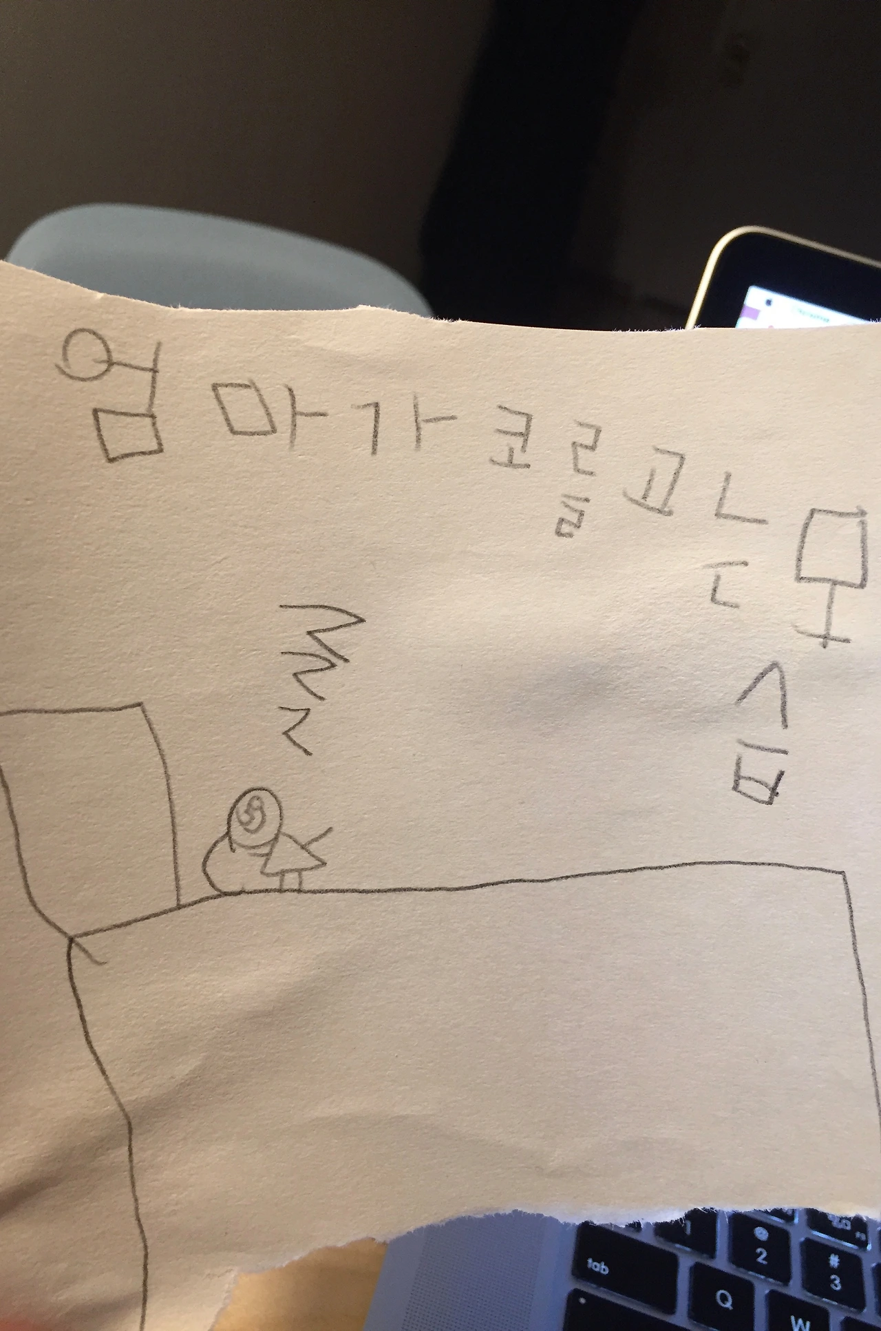 '좋아'라고 대답하는 큰 아이는 엄마가 발뺌을 못 하게(??) 증거 그림을 그려서 들이민다. 그리고 엄마를 보고 싶은 마음도 잠시인 아이들은 다행히도 아침 간식과 놀이의 세계로 빠져 들며 또 즐겁게 하루를 시작하였다.