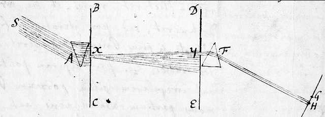 그는 위 그림과 같이 백색광이 프리즘을 통과할 때 나타나는 여러 색깔의 스펙트럼을 보며 고유의 색은 동일한 굴절률을 가진다는 사실을 밝혀냈다.