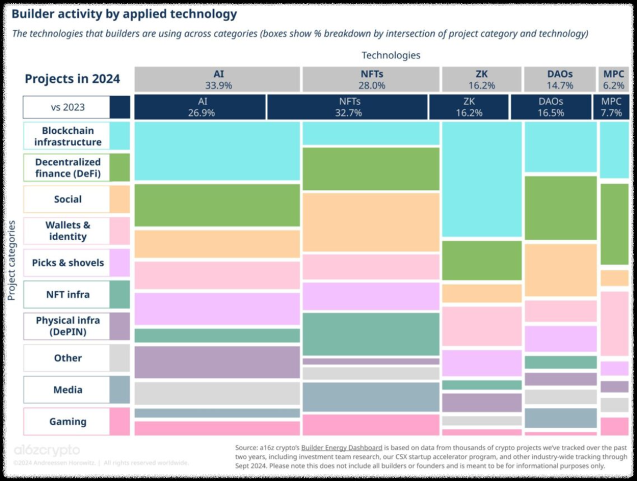 A16Zcrypto의 2024년 보고서에 따르면, 블록체인 분야의 AI 기술 활용률이 2023년 26.9%에서 2024년 33.9%로 증가했습니다. 특히 DeFi와 메인넷 분야에서 AI 기술을 적극적으로 도입하고 있습니다.