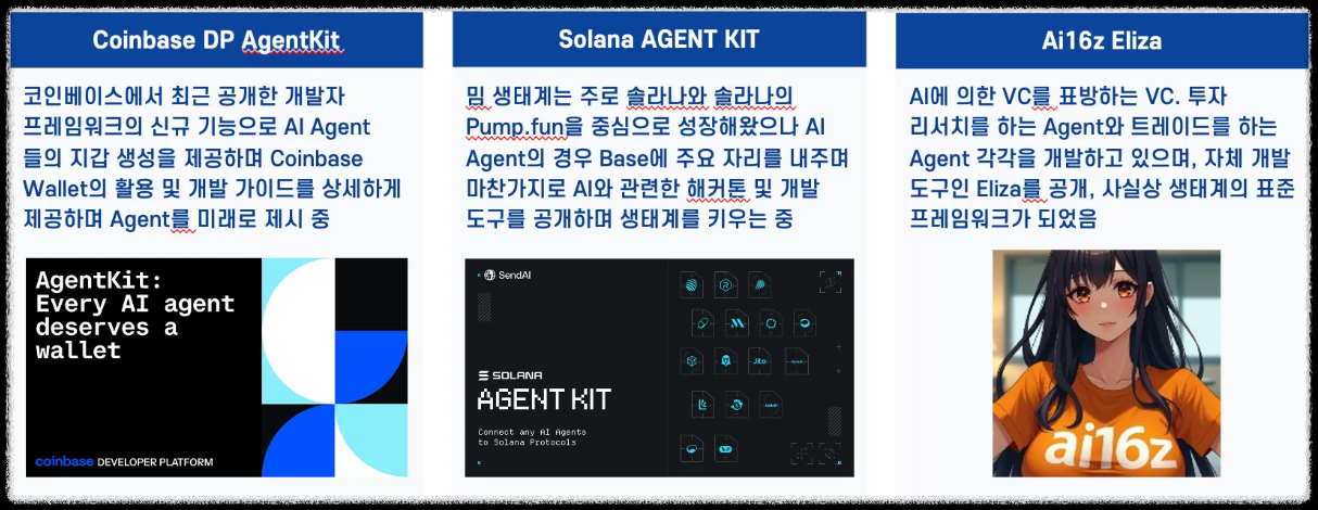블록체인 섹터에서 AEA는 밈코인 외에 가장 많은 소셜 지표와 온체인 지표를 달성하고 있는 분야입니다. 이에 따라 코인베이트 , 솔라나 , Ai16Z는 개발자들이 AEA를 손쉽게 구현할 수 있도록 Agent Kit를 개발자에게 제공하고 있습니다.