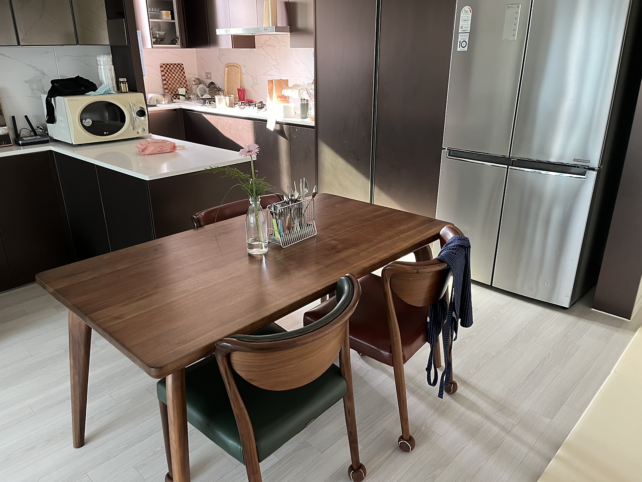 아일랜드 식탁 옆에 가로로 붙여 뒀던 식탁의 방향을 바꾸었다. 전에는 의자에 앉으면 냉장고 사용이 좀 불편했는데...