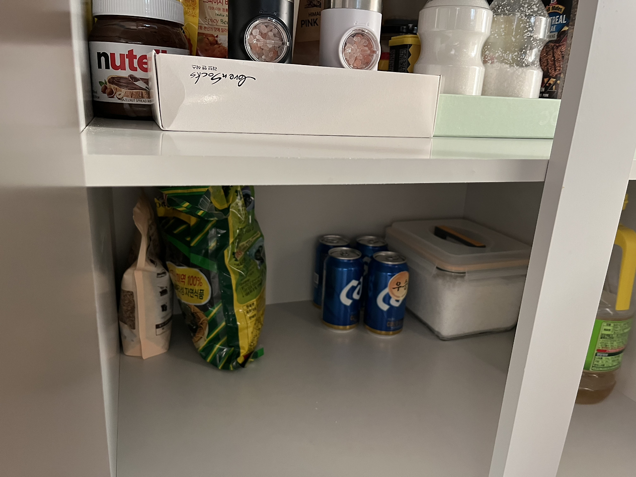 미리 사 둔 새 제품이나 소분해서 쓰기 위해 구매한 남은 제품은 맨 뒤로 배치를 하거나 아랫칸에 정리하였다.