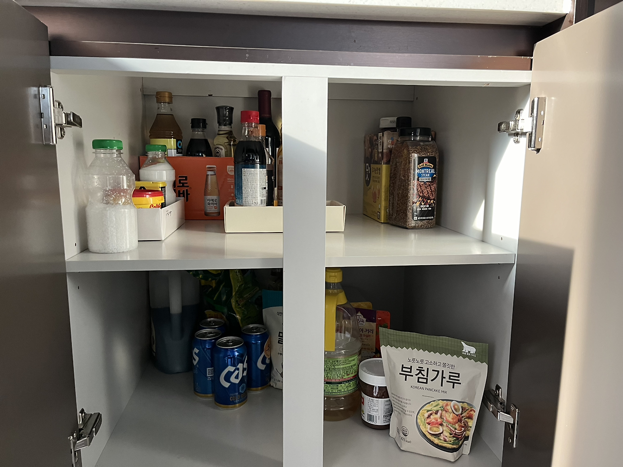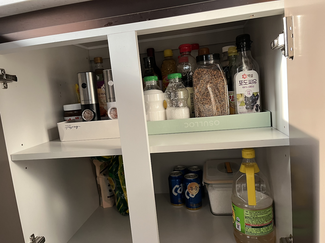 오랜만에 양념들 다 꺼내서 청소도 하고 기존 방식과 다르게 정리도 하니 뭔가 새로운 공간이 된 것 같아 기분이 좋아졌다.