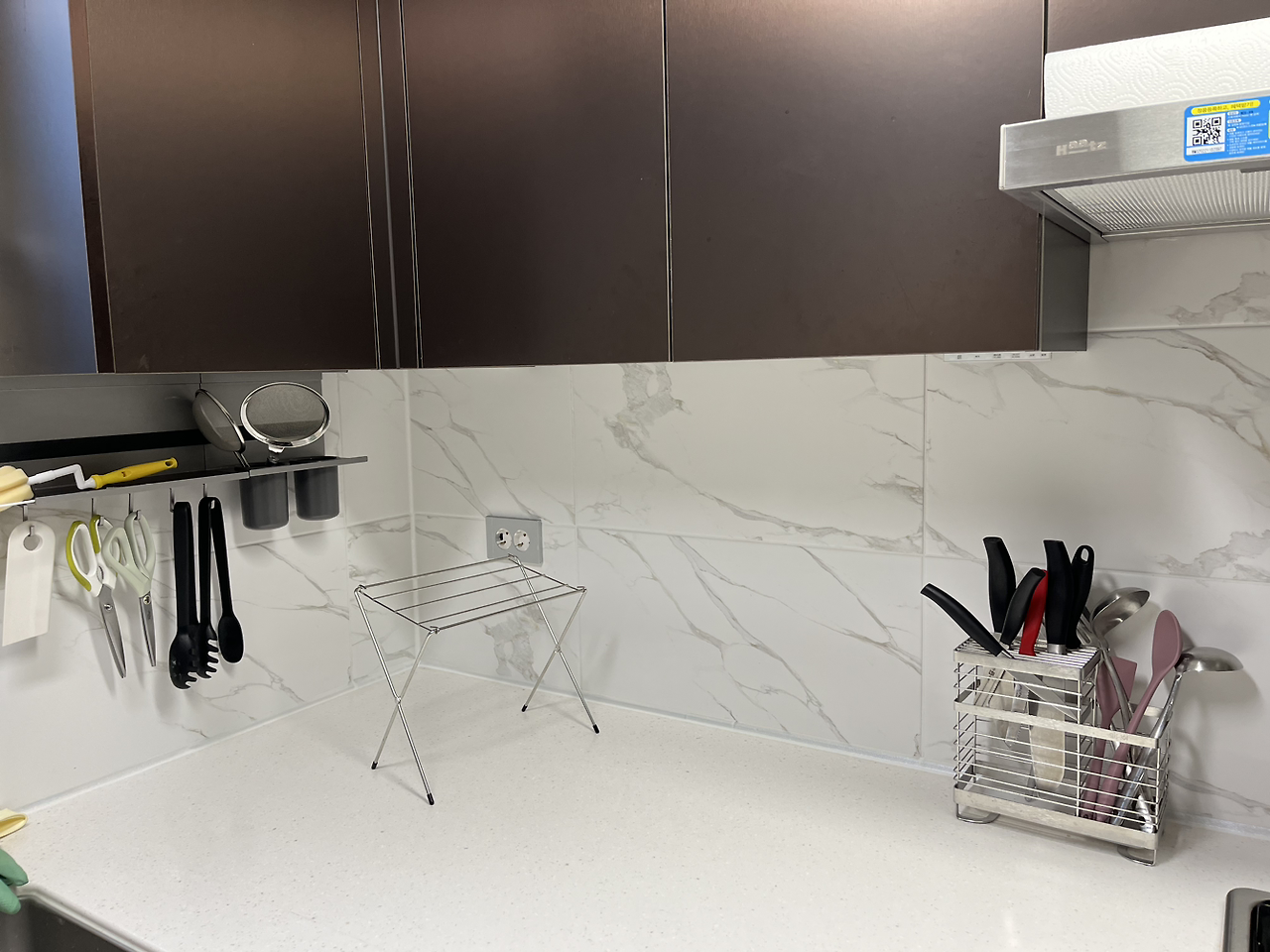 주방 도구들을 배치할 때 동선을 중요시하는 편인데 현재 모습은 조리도구가 한 공간에 모여 있지 않았다.