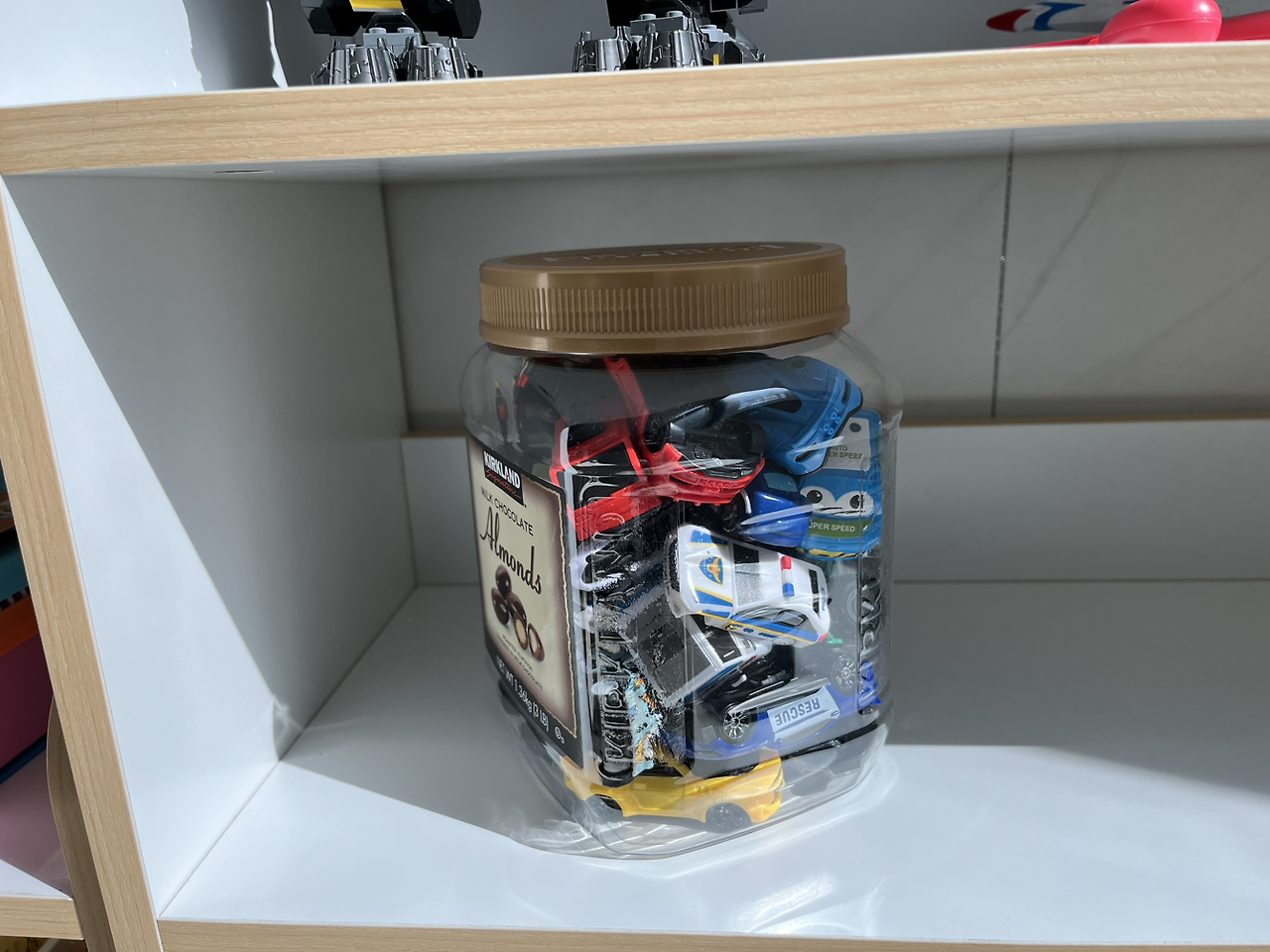 초콜릿을 먹고 나니 튼튼한 플라스틱 통이 생겼다. 아이의 미니 자동차들이 항상 정리하기 힘들었는데 딱 맞는 정리함이 나타 난 것이다.