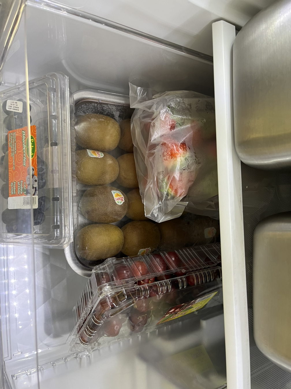 채소는 살짝 손질하여 통이나 일회용 비닐에 넣고.. 과일은 사용하지 않는 바트에 넣어 보관하기