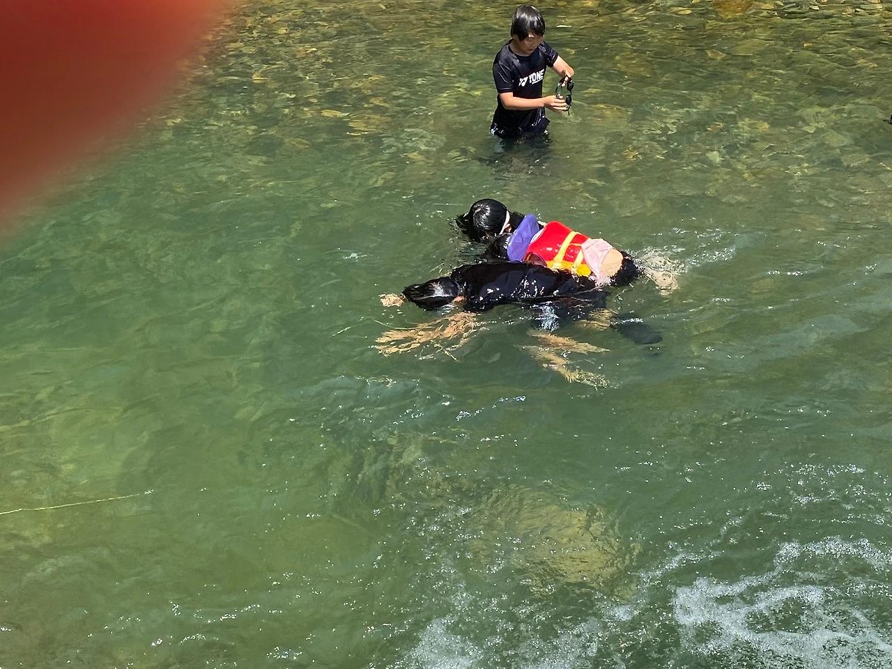 같이 모여 커다란 돌을 안은 보현이가 가라앉으면 주변 아이들도 같이 잠수하고 물속에서 보현이를 본다.