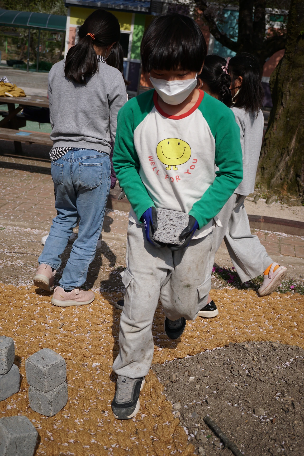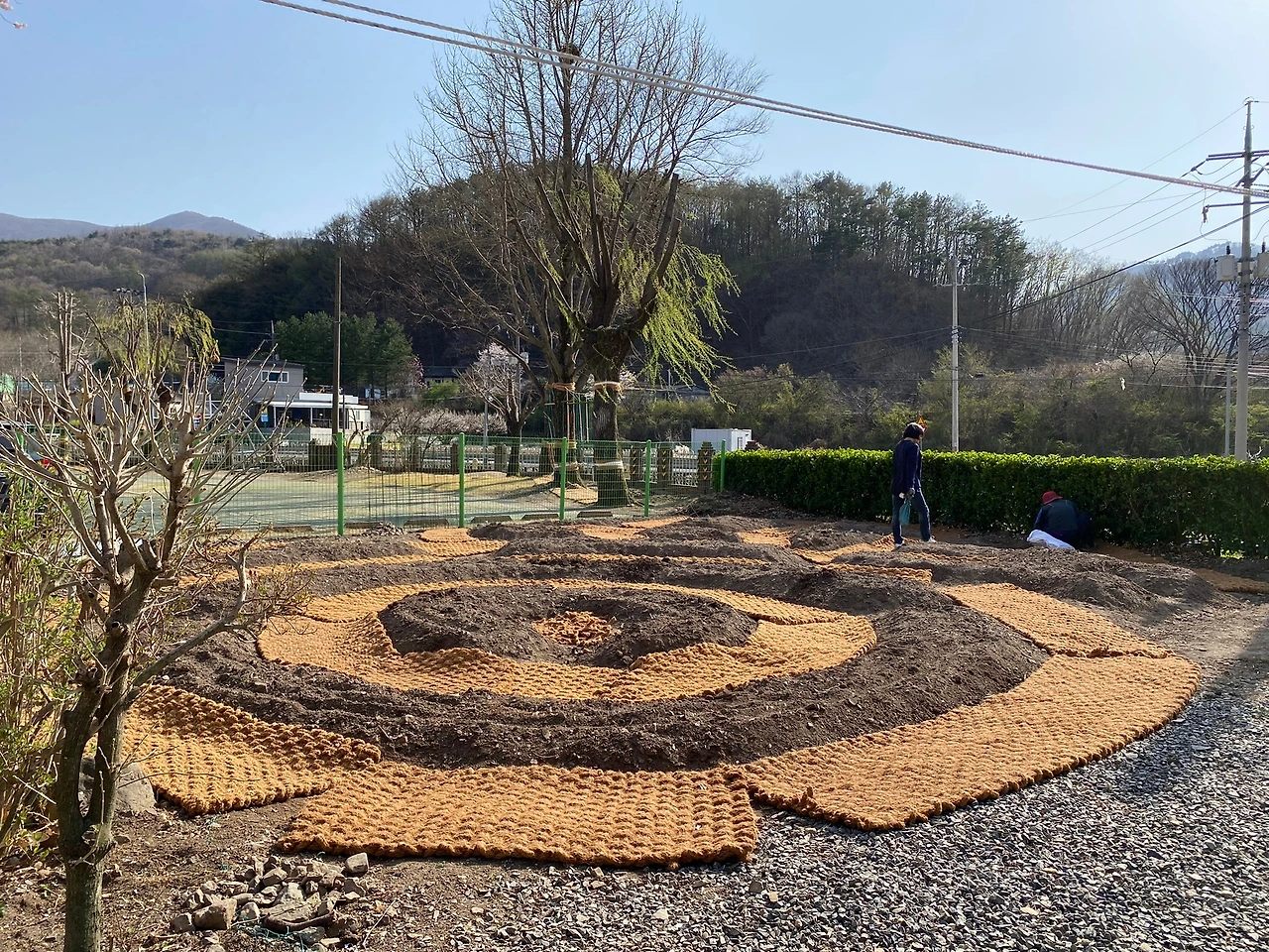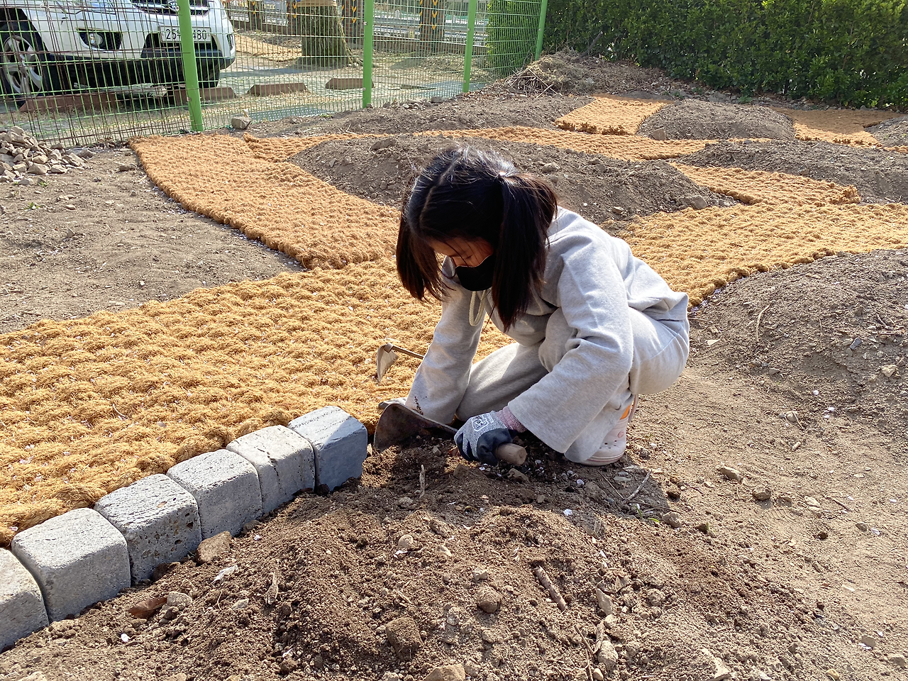 실제 힘든 작업이었다. 하지만 조금씩 만들어지고 완성되어가는 지렁이 모양, 나뭇잎 모양 숲밭을 보며 힘듬은 달아나고 우리 마음은 뿌듯함으로 채워졌다.