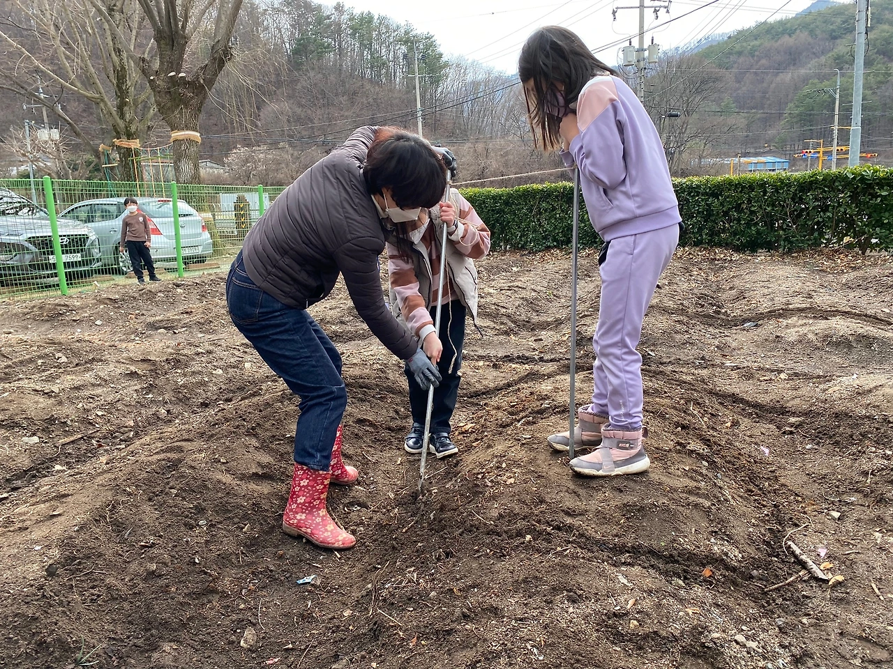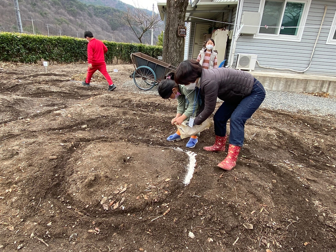 아이들과 한 삽씩 흙을 떠서 도면대로 고랑과 이랑을 만들고 사고석을 날라다 밭을 둘렀다.